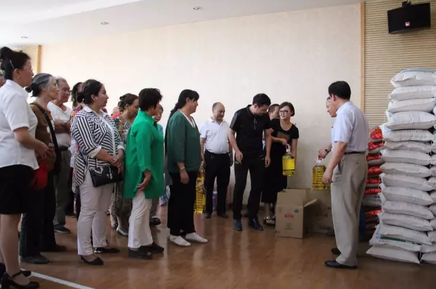 边疆区老人从爱心人士手中接过捐赠的物资